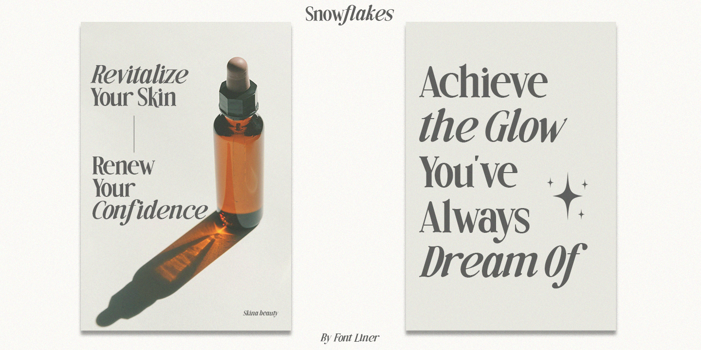 Snowflakes 是一款带有细致韵味的衬线字体,线条柔和、结构优雅,略带女性气质的笔触为设计增添温柔质感。