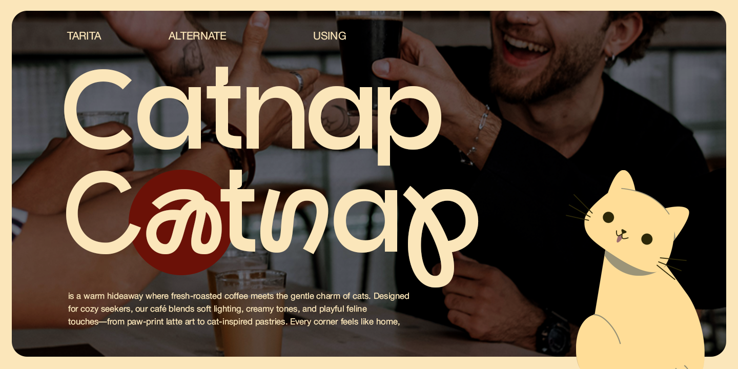 Tarita 是一款充满手作感和温暖气息的标题字体,灵动视觉搭配 44+ 创意替换字形,柔和曲线与俏皮笔触相融,让你的设计如同冬日里的烘焙甜品般温暖。